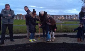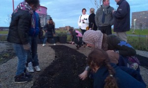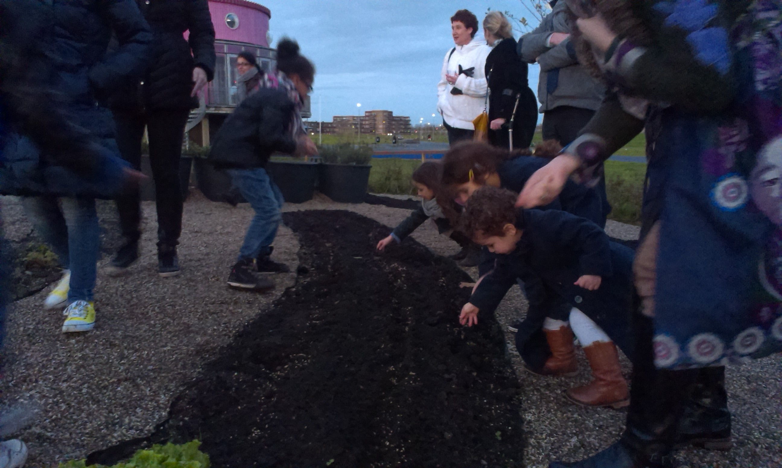 Op 20 November 2013 hebben de initiatiefnemers van de moestuin een borrel georganiseerd. Een glaasje Calvados en voor de kids heerlijke Flevosap. Het nieuwe hek werd gepresenteerd, buurtbewoners konden komen kijken, een praatje maken en er werd wintertarwe gezaaid.